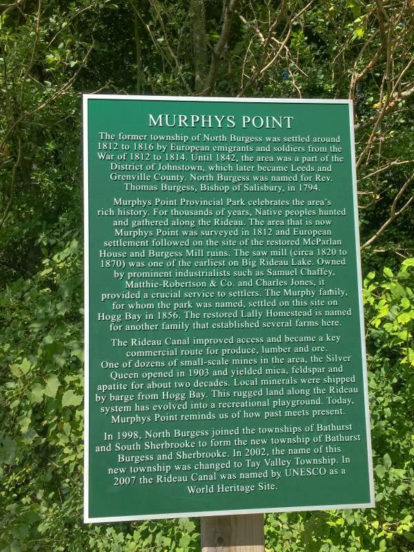 I really enjoyed this park, we were here once years ago but I definitely will come back. I have a friend, Erin, who reads my blog and I’m not sure if she has been to this park but if not, her boys would enjoy it. Murphy’s Point is a smallish park but with a lot to offer. It is located on Big Rideau Lake which is part of the historic Rideau Waterway.
