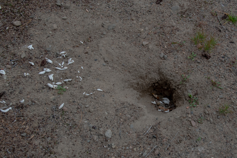 Another trail we took started out as an old road and then turned into a trail in the forest. At one spot, we saw some turtle nests. The nests were old and had been trashed by another animal. Most likely a fox or raccoon. We could see the egg shells scattered around.