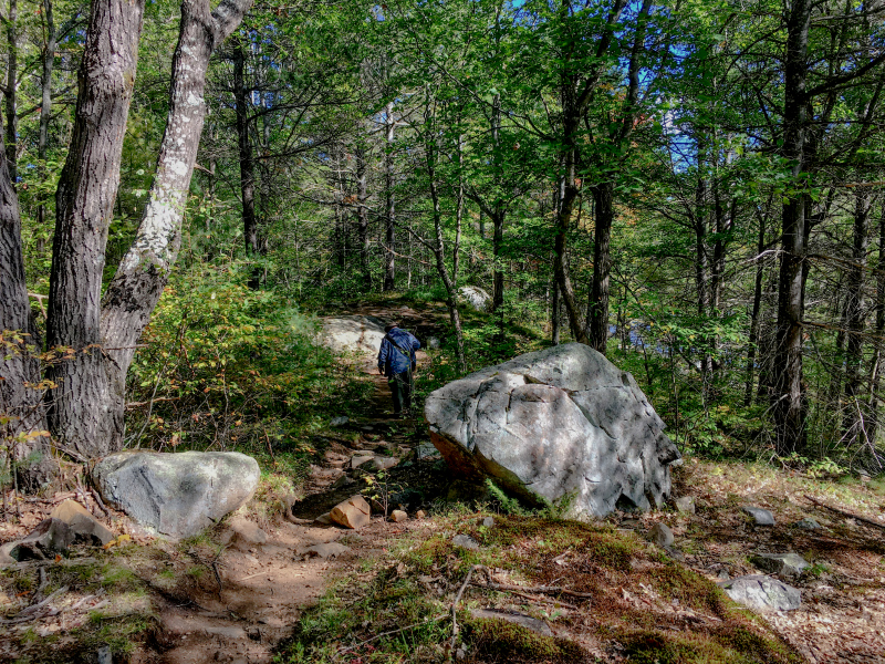 We like to canoe in Mazinaw Lake and Bon Echo Lake and you can also drive to the other end of the park and do a 500 m portage to paddle in Joeperry Lake and Pearson Lake. The trail to the lake from the parking lot is a nice trail. Clint takes his camera gear and canoe and I take the rest.
