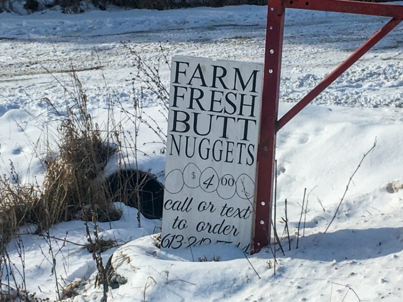 On our way to Massassauga Point we passed this sign by the side of the road. I have never heard this expression before and didn’t know quite what to make of it. Some of my friends don’t like and some find it funny. It’s certainly unique! Now if you aren’t sure, because I wasn’t, they are referring to eggs, who knew?