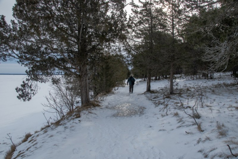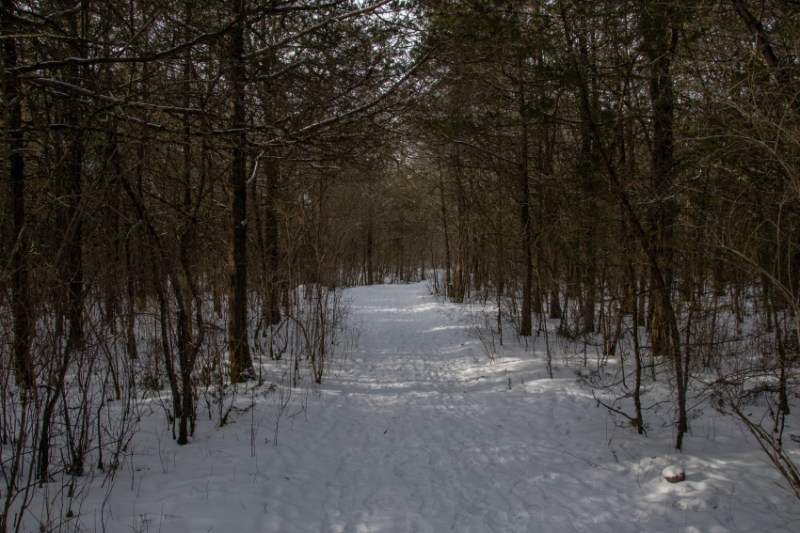 Massassauga Point Conservation Area is about 60 acres set on the Bay of Quinte. There are a few trails you can take and a spot for having a picnic. The parking lot is close to the water and we could see one lone ice hut just off the shore. Some portions of the trails follow the shoreline, which is really nice and some go through the forest or past an old quarry.