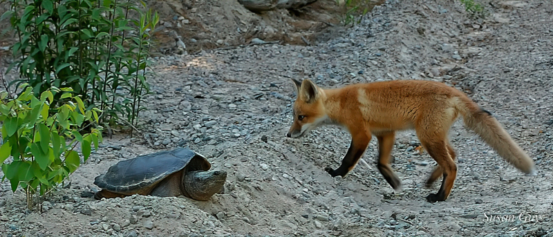 People were also feeding/baiting these animals for photos. One day we stopped to photograph the Old Fox and he was trying to climb this small tree. Another couple were at this spot photographing him; they had hung bacon over the branches of the tree to encourage a “better” photo. People were feeding the foxes so much that it got to the point that if they heard a car/truck door slam, they would run towards the vehicle.