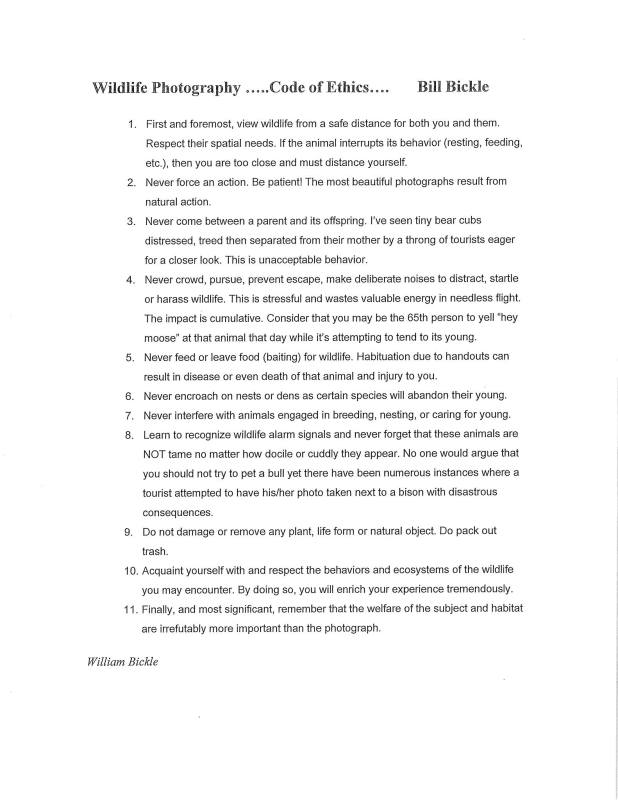 I have been meaning to write about this topic for quite some time but haven’t had the time. However, the other day, a friend of mine posted his own personal “Photography Code of Ethics”. His list is everything I believe in and so I asked his permission to use his list; plus it saves me time from making one, which I appreciate. Bill is a wonderful wildlife photographer having been featured in National Geographic magazine and other media outlets as well as winning several photography awards. His photos are terrific, please take a look at his website – Bill Bickle Photography