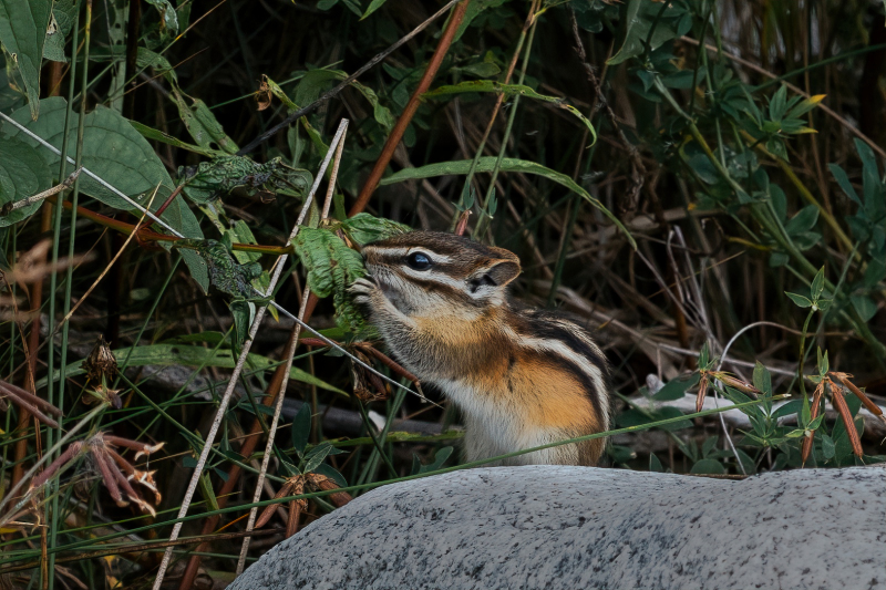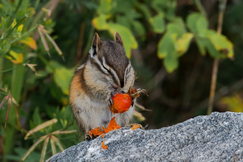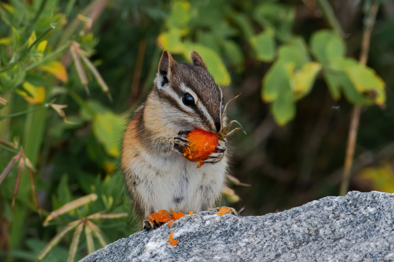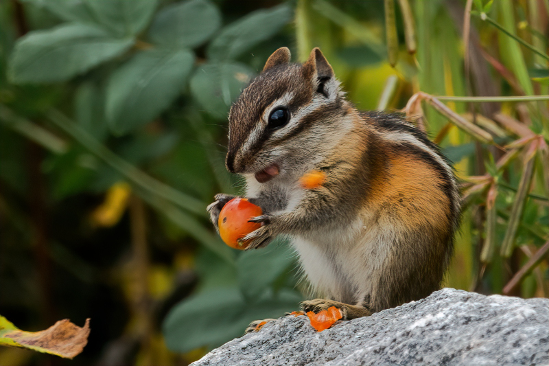 This past summer when we were staying at Nagagamisis Provincial Park, near Hornepayne, Ontario we left the park one afternoon to drive down to a river located nearby. We spent some time walking around and taking photos and on the way back to the truck we spotted this cute little chipmunk and he was eating Rosehips. I know, not super exciting and one chipmunk is much like another, but we got a big kick out of this guy. And I do love any animals, big or small. We have chipmunks, squirrels, rabbits, raccoons and more in our neighbourhood and I still enjoy watching them all.
