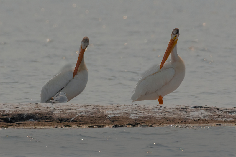 I feel like the 2 pelicans are looking at the seagull like they are asking who are you and why are you on our log?