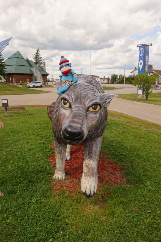 Hearst is a really nice and clean town and they have a big War Memorial in the middle of town, which I did not get a photo of and I’m not sure why. They have a really cool Visitor Centre with 2 big moose statues and wolf statues. We had a ton of fun photographing Trum on these statues. In case you are wondering, do we get weird looks when I walk around carrying a stuffed monkey? Yes we do. Do we care? No we don’t. We’re old but we can still have fun!
