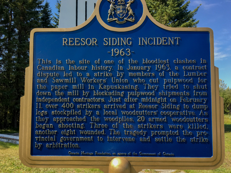 After we left Fushimi Provincial park we had to drive through the town of Mattice, as well as some other small towns, to get to our next destination. In Mattice we stopped at the statue of a voyageur and his canoe, wonderfully done, this is the Heart of the Missinaibi Waterway. Outside of Mattice, we stopped at Reesor Siding Memorial. No place to park but we stopped on the side of the highway and walked up to the statue. Pretty impressive and one of Stompin’ Tom Connors songs is based on this story. Song link. Stompin’ Tom is a Canadian country and folk singer-songwriter. His songs are all focused on his native Canada and he has written more than 300 songs, released on four dozen albums.