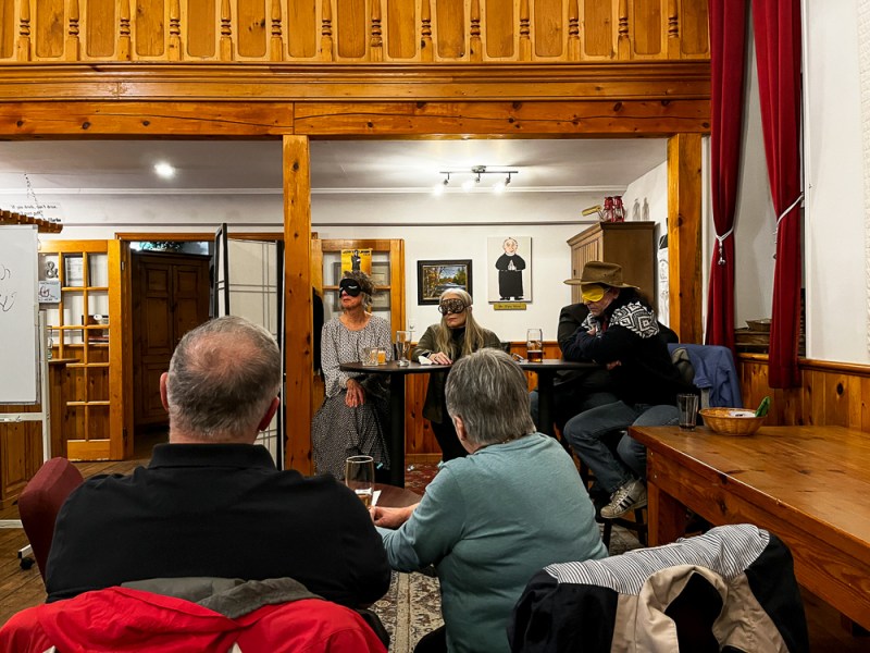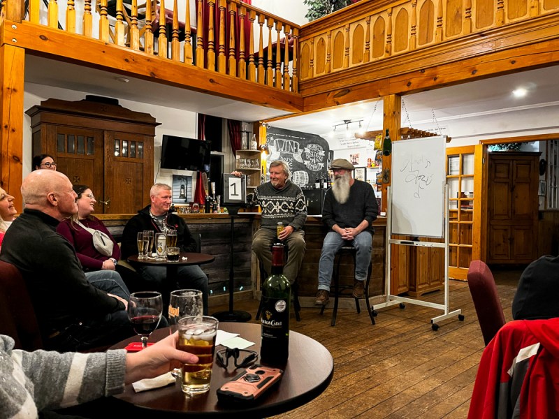 Our host sitting on the barstool and the “mystery guest” Andy Forgie sitting beside him, the panel was to the right.