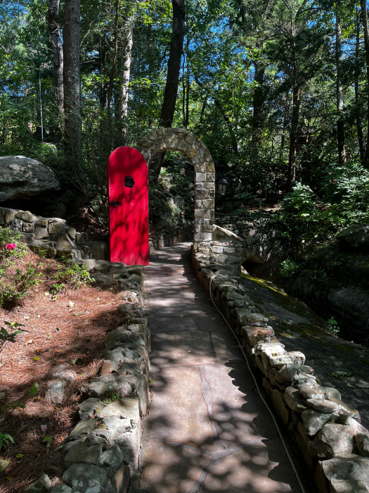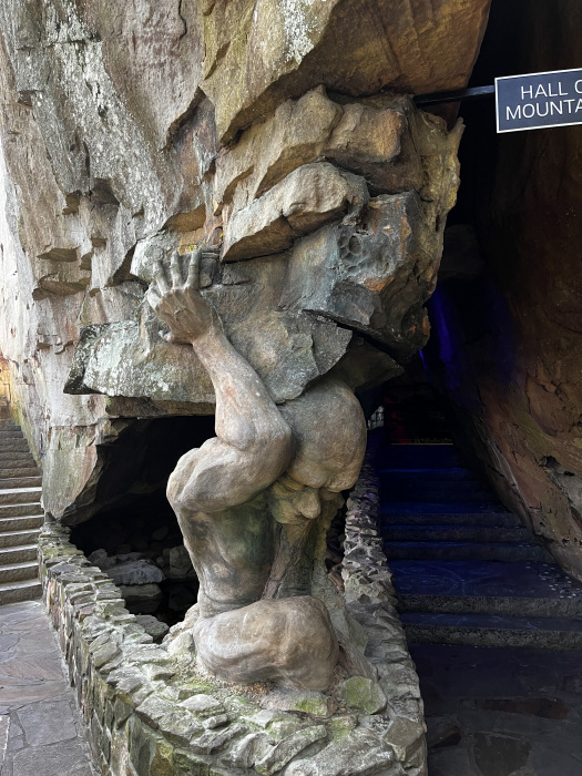 We were in Chattanooga, Tennessee for a few days and one day we drove 6 miles away to Lookout Mountain in North Georgia. We bought tickets to go to Rock City. This is one of the best tourist attractions I have ever been to and I have been to a lot. Mostly outdoors, you walk a trail through and around a mountain and see some amazing outdoor sculptures and other items of interest. Below is a quote from their website. Above photo, and first one below, are inside a cave we walked through and they had quite a number of storybook scenes showcasing Mother Goose stories.