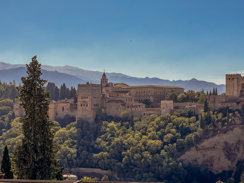Alhambra looked to be a very cool place and we were supposed to go there for a tour but apparently there was an EU 2023 summit or some such thing going on at the castle and our tickets were cancelled. And not only that, as we drove to the hotel we were to stay at, which was a hop, skip and a jump from the Castle, we were stopped and we had to leave the bus and take our luggage and walk the rest of the way to the hotel. There were apparently 5000 police in the city and area. Upon arriving at the hotel, because of the Summit, we weren’t allowed to leave the hotel, not even walk the grounds. We sat on the beautiful, big verandah and drank and watched the police horses go by and all the limos.