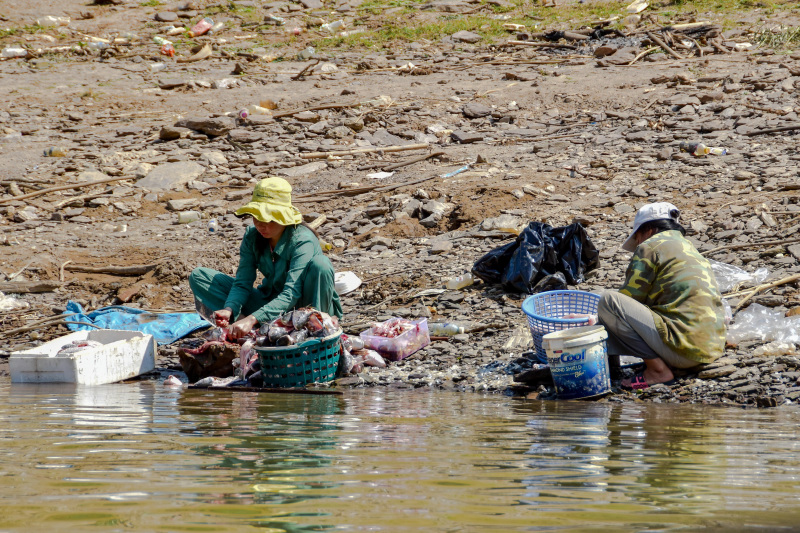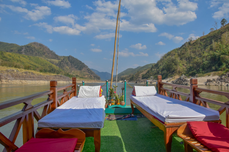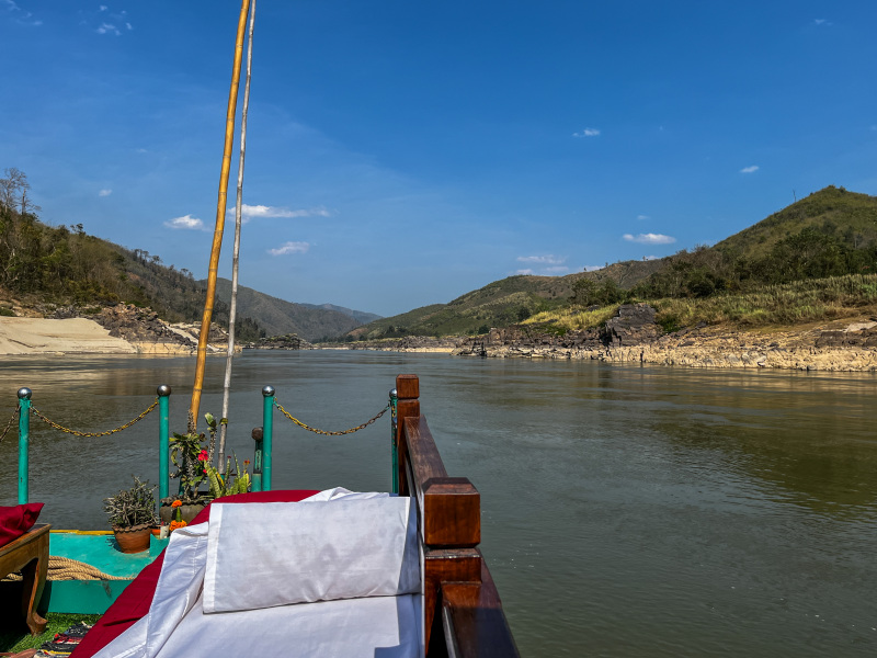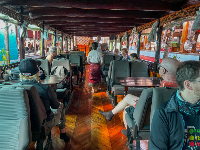 So now we are headed to our boat and we are going to travel the Mekong River for two days. Our boat is very long and narrow with washrooms in the back and then tables and chairs inside and then you can go out on the front of the boat and there are other chairs and two lounge chairs. The first day we did about a 160 km down the river and it took about 8 hours. They cooked food for us and we had beer and other beverages and there was always something to see.