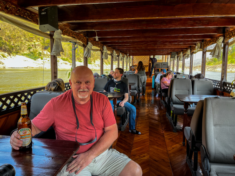 So below are photos of the river and the boat we were on for 2 days. Also a photo of me with a beer, big surprise! and one of Clint, also with a beer and they were huge bottles!