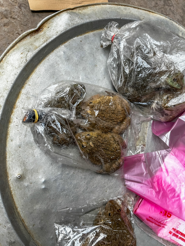 First photo is Pigs ears, then live toads in plastic bags and then some other vendors.