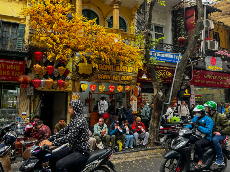 Sitting on tiny chairs and eating Banh Mi sandwiches