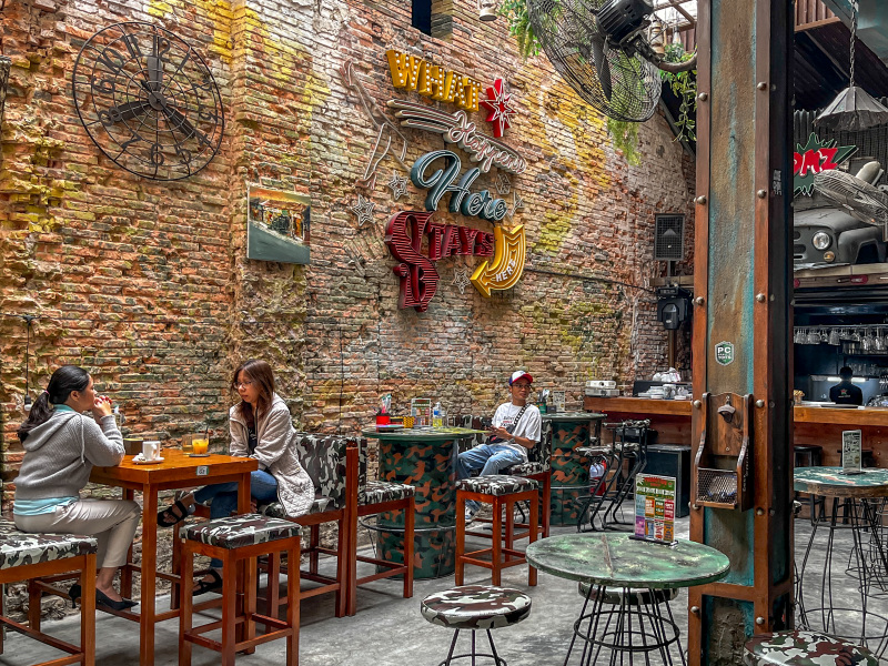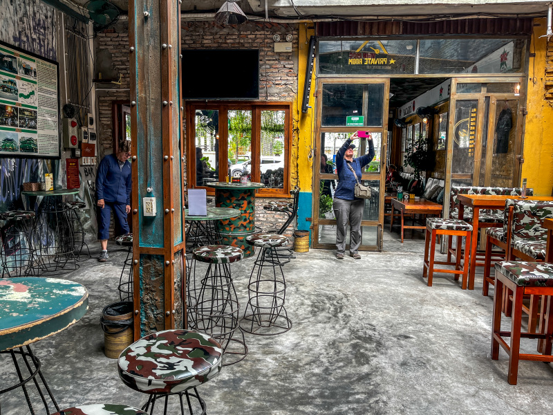 After we got off the train, we went to our hotel to drop our luggage off and then walked to a restaurant for breakfast. It was set up like an old Vietnam war restaurant. Old Jeeps, camouflage, and other artifacts.