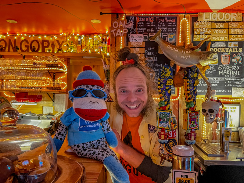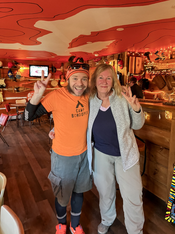 Whitney is located at the East Gate into the park, approximately 1200 residents. They have a couple of restaurants, gas station, grocery store and the other usual amenities. One of the spots we love to go to is Bongopix Tavern. It’s a very unique spot and I forgot to get a photo of the building from the outside. Bongo and Andrea own the building as well as some cabins across the road. They rent out rooms and cabins as well as work in the Tavern. They are such great people, smart, funny and very hard working. I have never met such welcoming people so that it doesn’t feel like going to a tavern, it feels like going to a friend’s house. They make really great sandwiches, coffee and delicious cocktails and of course they have beer! There is entertainment 3 nights a week from Bongo and Andrea and anyone else who wants to pick up an instrument and/or sing. One night we went to play Trivia, I love playing Trivia. I believe there were 9 teams, most had four people but of course, we were only two. I called our team No Hope but we did have hope because we actually beat 3 or 4 other teams which we did not expect! It was a great evening. Trum even went in one night to meet Bongo.