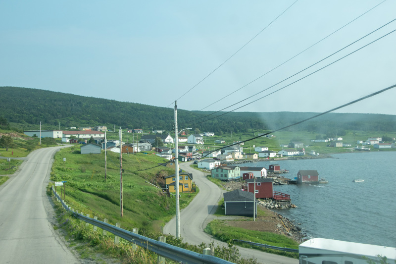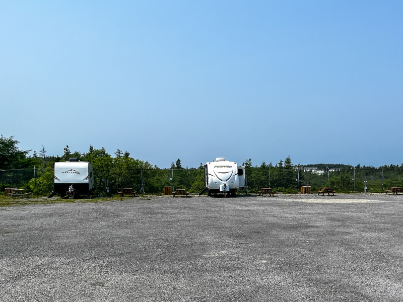 We had to be at the ferry by 830 and we were there earlier and so was everyone else because the ferry actually left 10 minutes early. We drove our truck/trailer on but you are not allowed to stay in your vehicle so up on the deck we went. The photo above is the view of St Barbe’s Newfoundland as we approach the docks. We stayed at St Barbe’s RV Park which was a 2 minute drive from the ferry. RV Park is a bit of a misnomer as it was a huge gravel parking lot but we had stayed here before on another trip and it was okay. There is our trailer below on the right. It was $45 a night with electricity and water and there was showers and laundry in a building to the left.