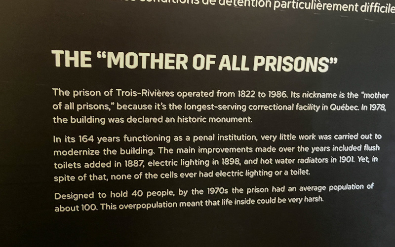 They only do one English tour of the Old Prison at 12:15 most days and it takes about 90 minutes. And if you are wondering what the name of the prison is, it’s literally the Old Prison or en francais…Vieille Prison de Trois Rivieres. Our guide was very good and he told us that right up until the prison closed in 1986, the prisoners had to use buckets in their cells as they did not have toilets. The prison was shut down for unsanitary conditions. Also, it was supposed to hold about 40 people but upwards of 100 prisoners were housed here. Crime doesn’t pay……….