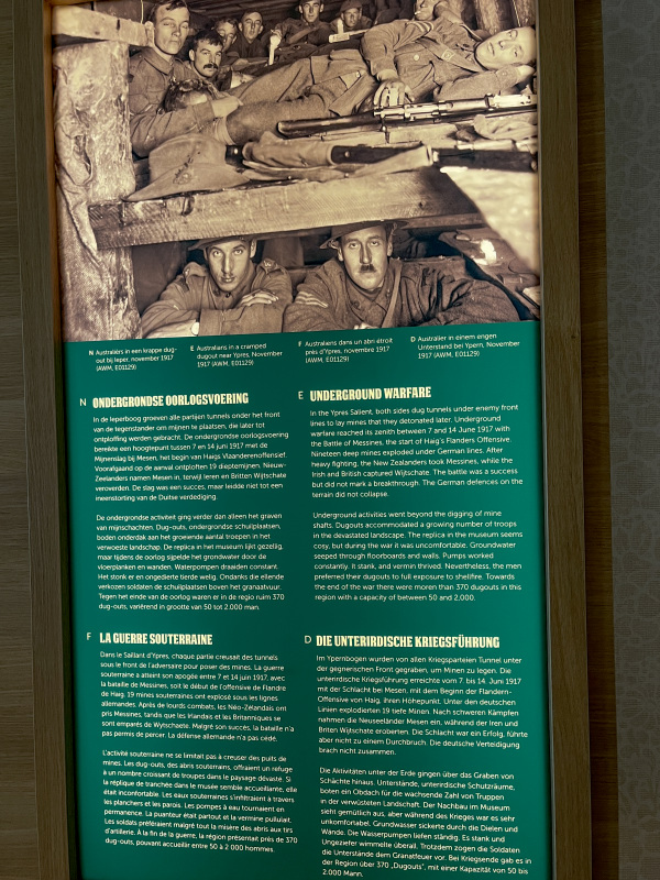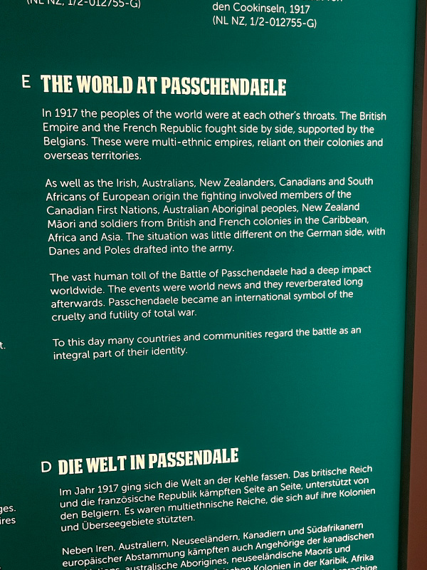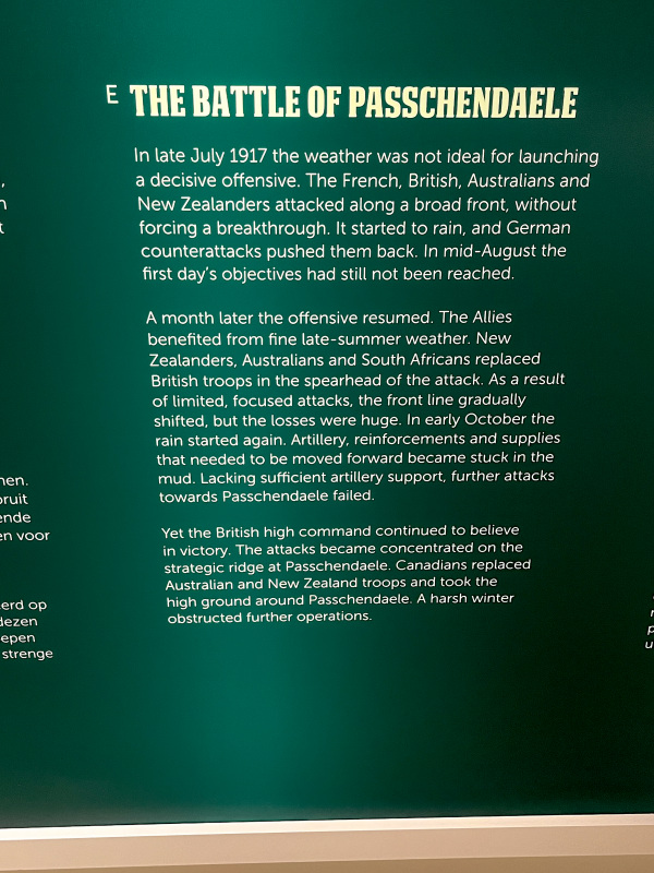 There is so much history in this area. For a bit of background, the Ypres Salient was a contested bulge in the Allied front lines during WWI, surrounded on three sides by German forces who had the good fortune to be on higher ground. Ypres was the gateway to ports such as Dunkirk and Calais; it had to be held even though Allied troops were constantly hammered with artillery fire, gas attacks and trench warfare. The Allied troops were a combination of the British Empire (British, Canadian, Australian, Indian and South African) as well as French and Belgian troops. There were 3 major defining battles at this location during WWI. The First Battle of Ypres (Oct-Nov 1914) stabilizing the Western Front; Second Battle of Ypres (22 April – 25 May 1915) first large-scale use of chlorine gas by Germany and also where Canadian John McCrae wrote “In Flanders Fields”; Third Battle of Ypres (31 July – 10 Nov 1917) called Passchendaele.