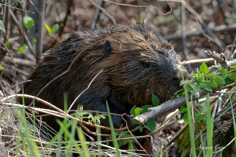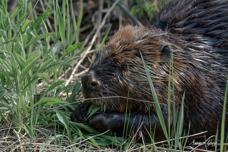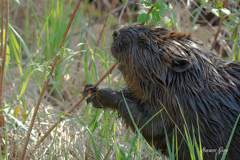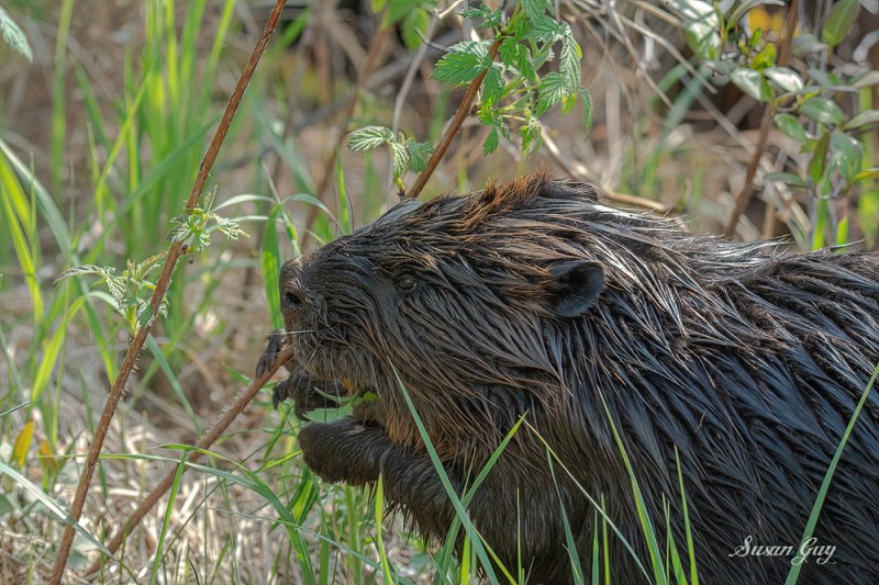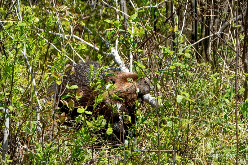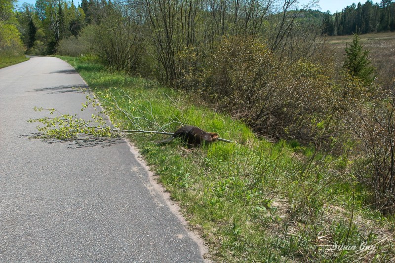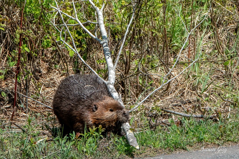 One day on a drive in the Park, we came across a beaver on the side of the road eating his lunch. We kept our distance but continued to watch him/her and at one point he crossed the road and we watched him chew down this tiny branch, well tiny for us but not for him.