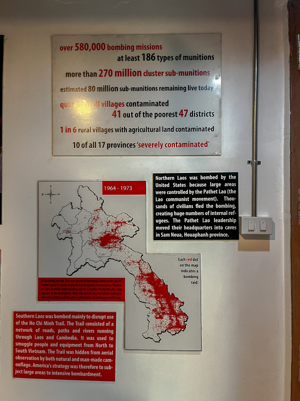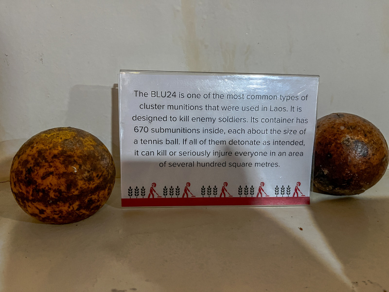 Later that day Clint and I walked to the Laos Visitor centre with another couple from our group. It was not your normal Visitor Centre, it was quite sad and upsetting. “Did you know Laos is the most heavily bombed country in the world, per capita? More than two million tons of bombs were dropped on Laos between 1964 and 1973. An estimated 30 per cent of them did not detonate, and continue to kill and injure. They also prevent communities from growing enough food and accessing schools, hospitals and clean water.” I took this quote from the Visitor Centre website.