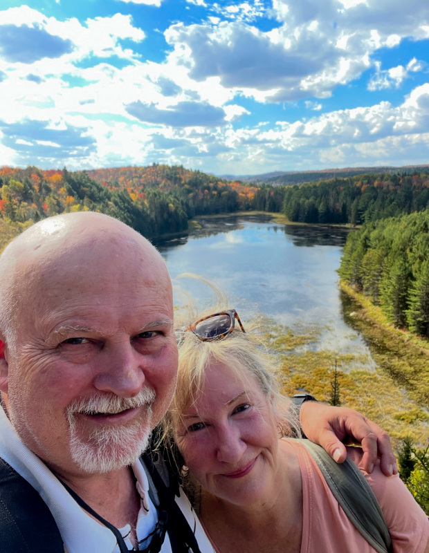 We like to hike and there are endless trails to walk. Some of the trails are pretty rough, one of them is my favourite but it’s not easy in spots. I always carry a walking stick and of course I have Clint to help me.