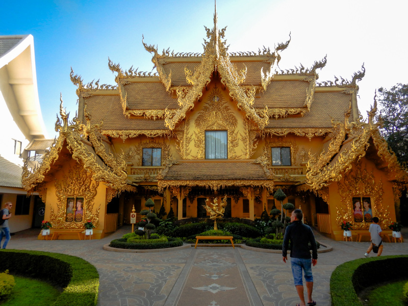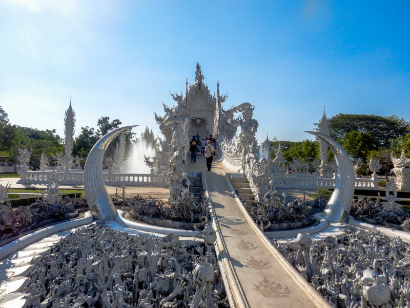 After our bike ride, we packed up our stuff and took a 5 hour bus ride to Chiang Khong, still in Thailand. ON the way we stopped at the White Palace, or White Temple but the official name is Wat Rong Khun. The white exterior is supposed to reflect purity and also to reflect the teachings of Buddha. A couple of buildings further in the park were gold in colour. Beautiful archictecture.